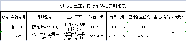 8月5日山東五蓮農(nóng)商行帕薩特和霸銳兩輛車拍賣公告