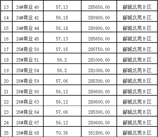 1、夏津縣鄃城北苑商業(yè)房25間。建筑面積56.12---130.51平方米不等,參考價(jià)28.06---71.78萬(wàn)元。(起拍價(jià)及單套面積詳見公司網(wǎng)站公眾號(hào)及標(biāo)的張貼公告)競(jìng)買保證金3萬(wàn)元/間。多賣多交。